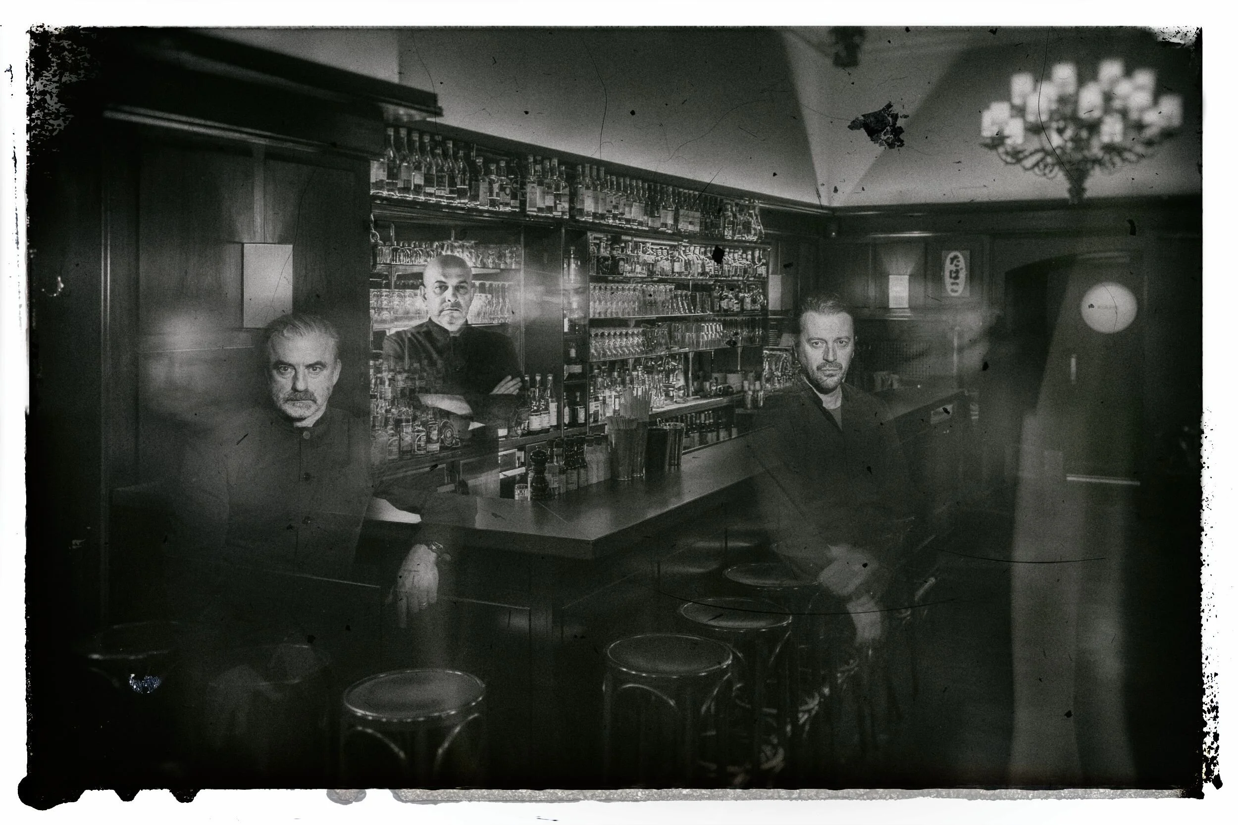 Black/white long exposed photos show the bartenders in a ghostly situation. Half there, half gone…